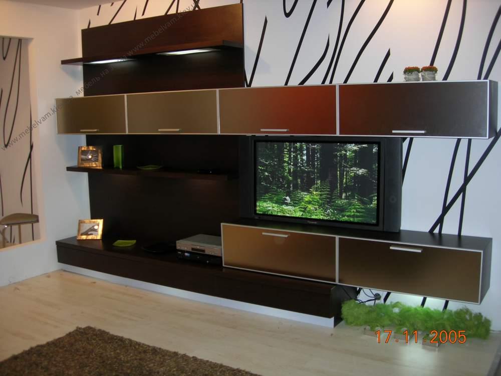Мебель в стиле Хай-тек, мебельная горка с крашеными фасадами в алюминиевой рамке. Материал: Корпус - ДСП Дуб Венге темный, Фасады - Стекло крашенное бронза в алюминиевой рамке.