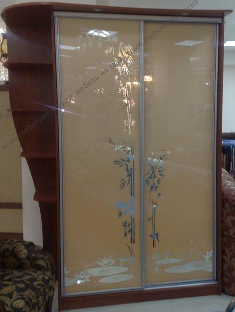 Маленький шкаф-купе дополнен фигурным угловым окончанием, крыша с подсветкой. Материал: Корпус - ДСП Яблоня темная; Система Braun - цвет Алюминий; Фасады - Зеркало с пескоструйным рисунком в одном цвете.