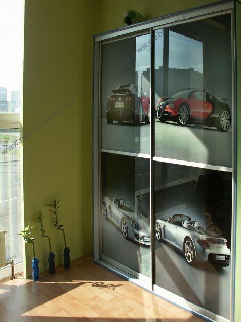 Маленький встроенный шкаф-купе с фото-фасадами, разделенными с помощью разделительного профиля. Материал: Фасады с соединительными планками – Фотопечать; Система Braun – цвет Алюминий.