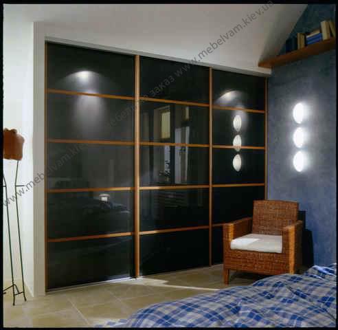 Шкаф-купе на 3 двери с соединительными планками. Система Braun (Браун) Орех лесной. Фасады стекло крашеное. Материал: Фасады с соединительными планками - Стекло Лакобель; Система Braun - цвет Орех Лесной.