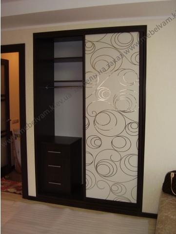 Маленький встроенный шкаф-купе с оригинальными фасадами в системе Braun (Браун) ламинированной в цвет дерева. Материал: Корпус - ДСП Дуб Венге темный; Фасады Зеркало с рисунком; Система Braun - цвет Венге.
