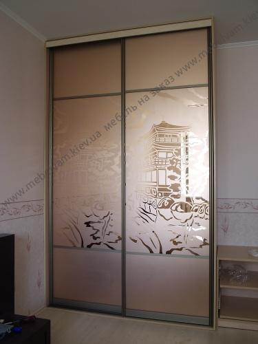 Шкаф-купе с оригинальным пескоструйным рисунком на фасадах, разделенных с помощью разделительного профиля. Система Браун Бронза. Материал: Корпус - ДСП Дуб Молочный; Фасады Зеркало с рисунком; Система Braun - цвет Бронза.