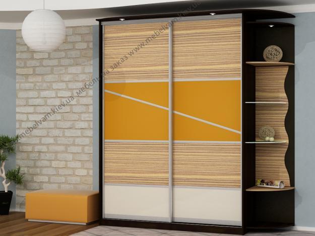 Оригинальный шкаф-купе с радиусной полкой по одной стороне. Крыша шкафа с подсветкой. Материал: Корпус - ДСП Дуб Венге темный; Фасады Стекло Лакобель + ДСП; Система Braun - цвет Алюминий.