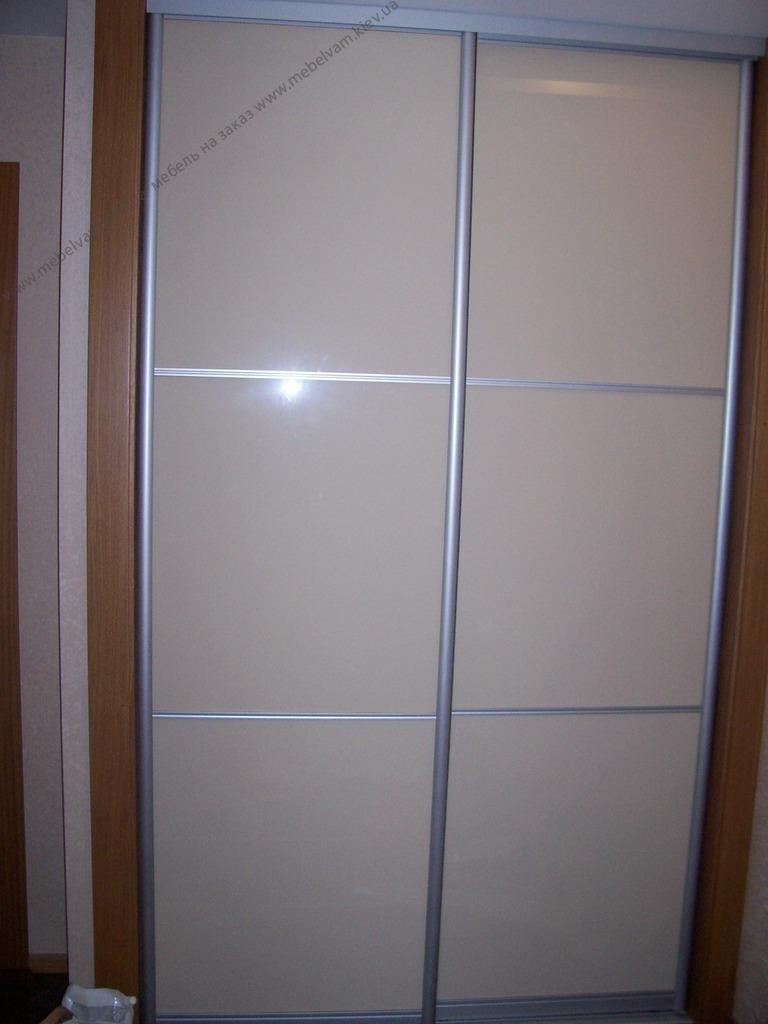 Шкаф-купе на 2 двери. Система Браун с соединительными планками цвет Алюминий. Фасады стекло крашеное. Материал: Корпус - ДСП Орех лесной; Фасады Стекло Лакобель; Система Braun - цвет Алюминий.