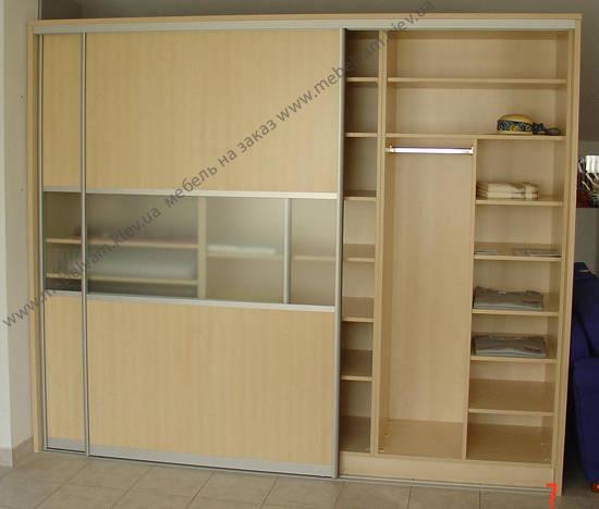 Шкаф-купе на 2 двери с соединительными планками. Фасады ДСП и стекло сатин. Система Браун Алюминий. Материал: Корпус - ДСП Орех Болонья светлый; Фасады ДСП Орех Болонья светлый + Стекло сатин; Система Braun - цвет Алюминий.