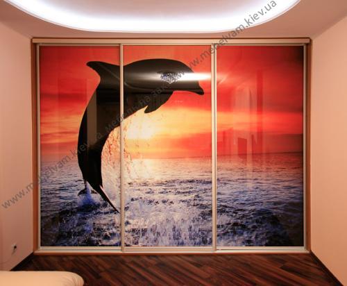 Шкаф-купе с фотопечатью на фасадах. Раздвижная система-купе (Браун) Браш. Внутреннее наполнение: ящики, штанги, полки. Материал: Корпус - ДСП Вишня; Система Braun - цвет Браш; Фасады - фотопечать.