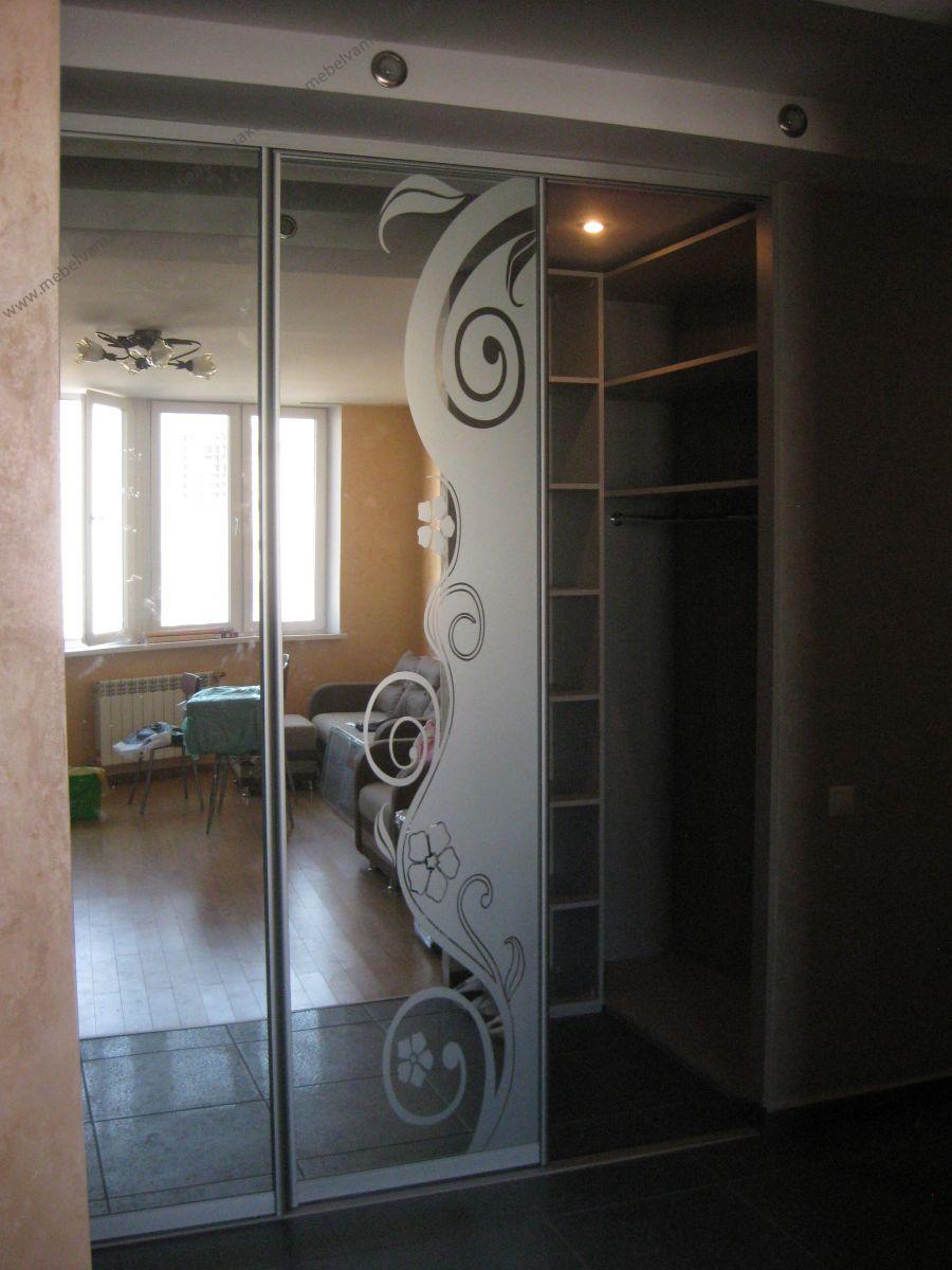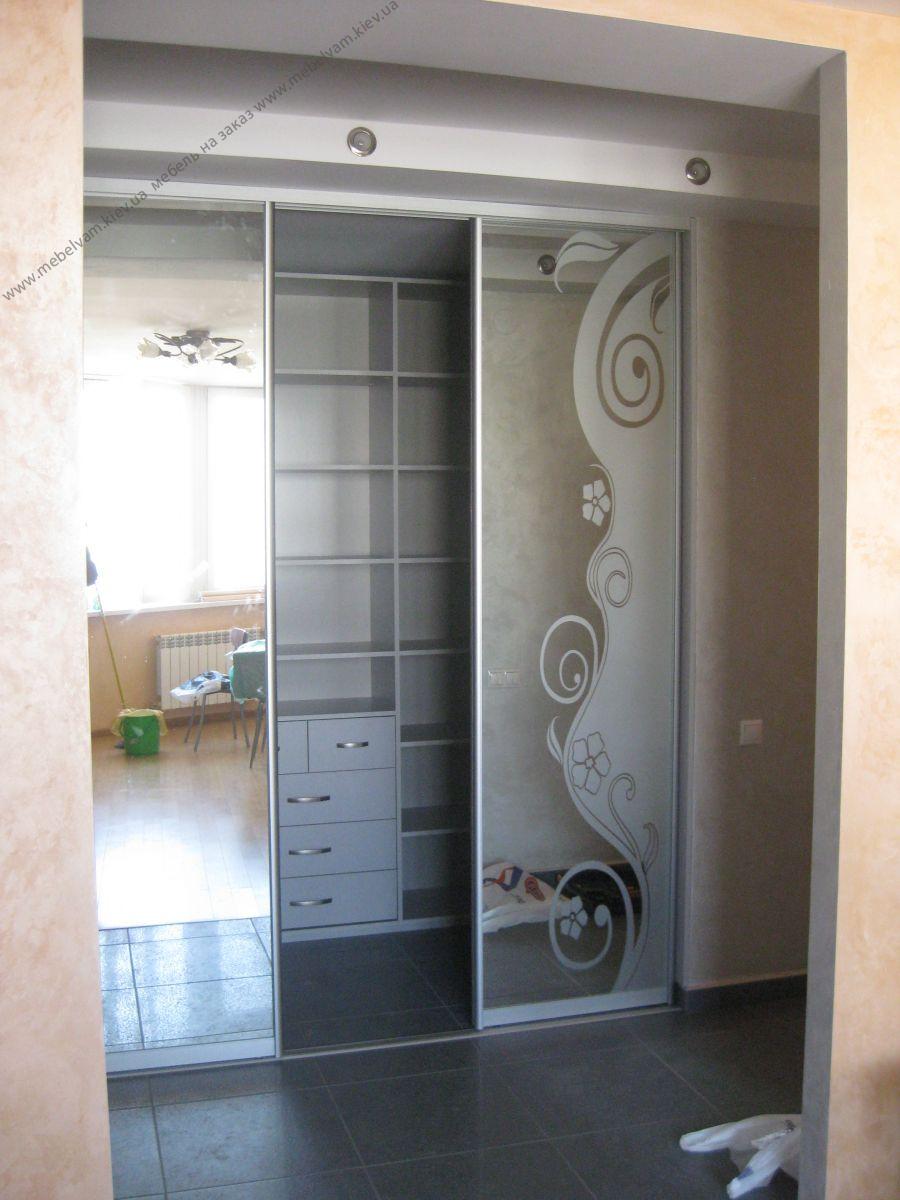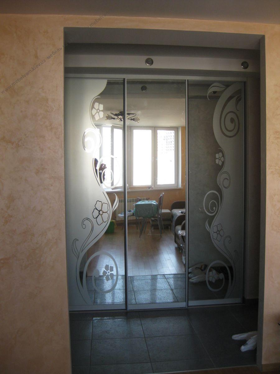 Шкаф-купе 3-х дверный фасады Зеркало с нанесением пескоструйного рисунка. Большой внутренний объем конструкции такого шкафа позволяет разместить большое количество вещей. Материал: Корпус - ДСП Серый; Фасады Зеркало с рисунком; Система Braun - цвет Алюминий.
