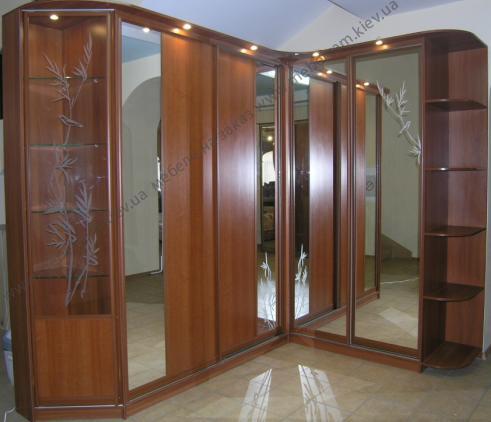 Шкаф-купе угловой, с радиусной полкой для сувениров и подсветкой, на отельные фасады нанесен пескоструйный рисунок, в виде веточки. Материал: Корпус - ДСП Орех лесной. Фасады - зеркало с рисунком + ДСП. Система Braun - цвет Орех лесной