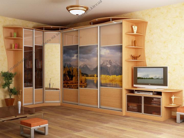 Большого размера угловой шкаф-купе, фасады фотопечать. двойная крыша с подсветкой. Материал: Корпус - ДСП Бук Тироль. Фасады - фотопечать + стекло Лакобель + ДСП. Система Braun - цвет алюминий