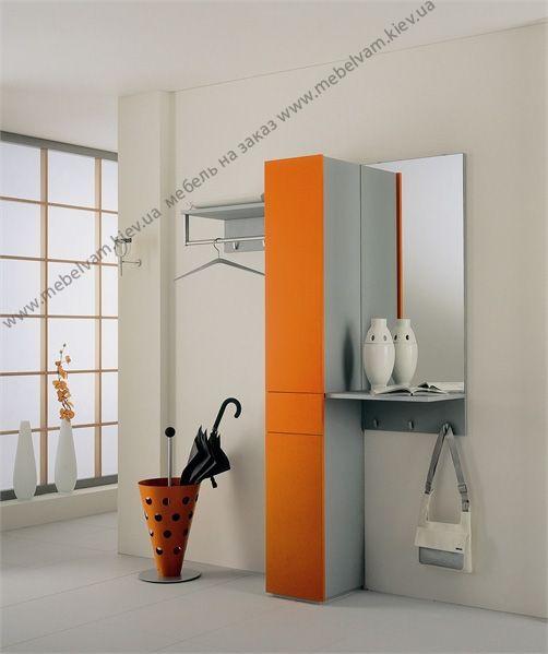 Современная мини-прихожая Хай-тек. Яркий оранжевый фасад на пенале является контрастным элементом дизайна прихожей. Материал: Корпус - ДСП EGGER U 775 Бело-серый ST15; Фасады - МДФ Global Померанцево GL TRB 33