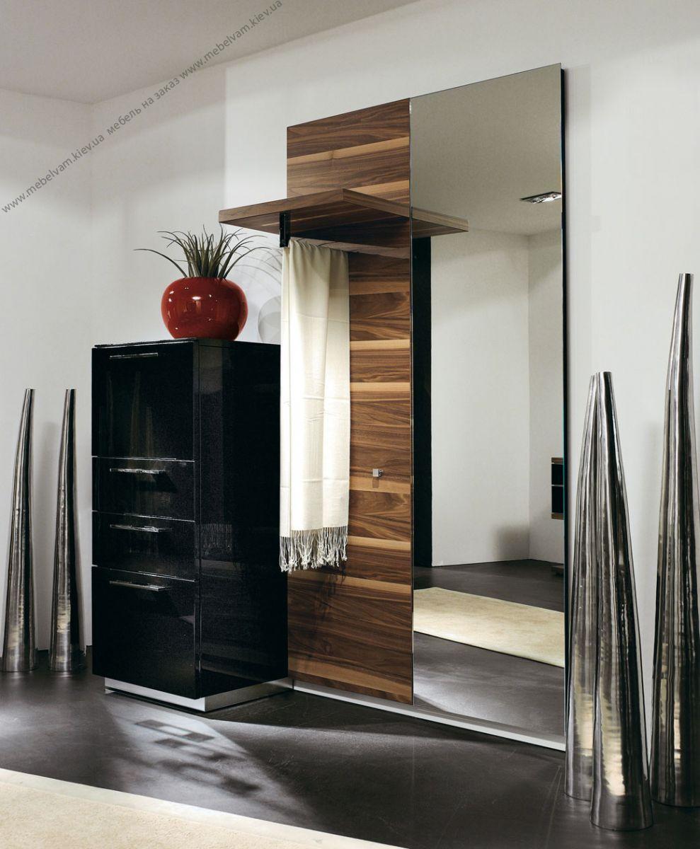 Мебель для прихожей небольшого размера. Глянцевая тумба-комод черного цвета, зеркало и вешалка с ярко выраженной деревянной структкрой создают стильный комплект мебели для прихожей. Материал: ДСП EGGER H 3778 Орех карибиан натуральный ST9; МДФ Global Черный GL TRB 13