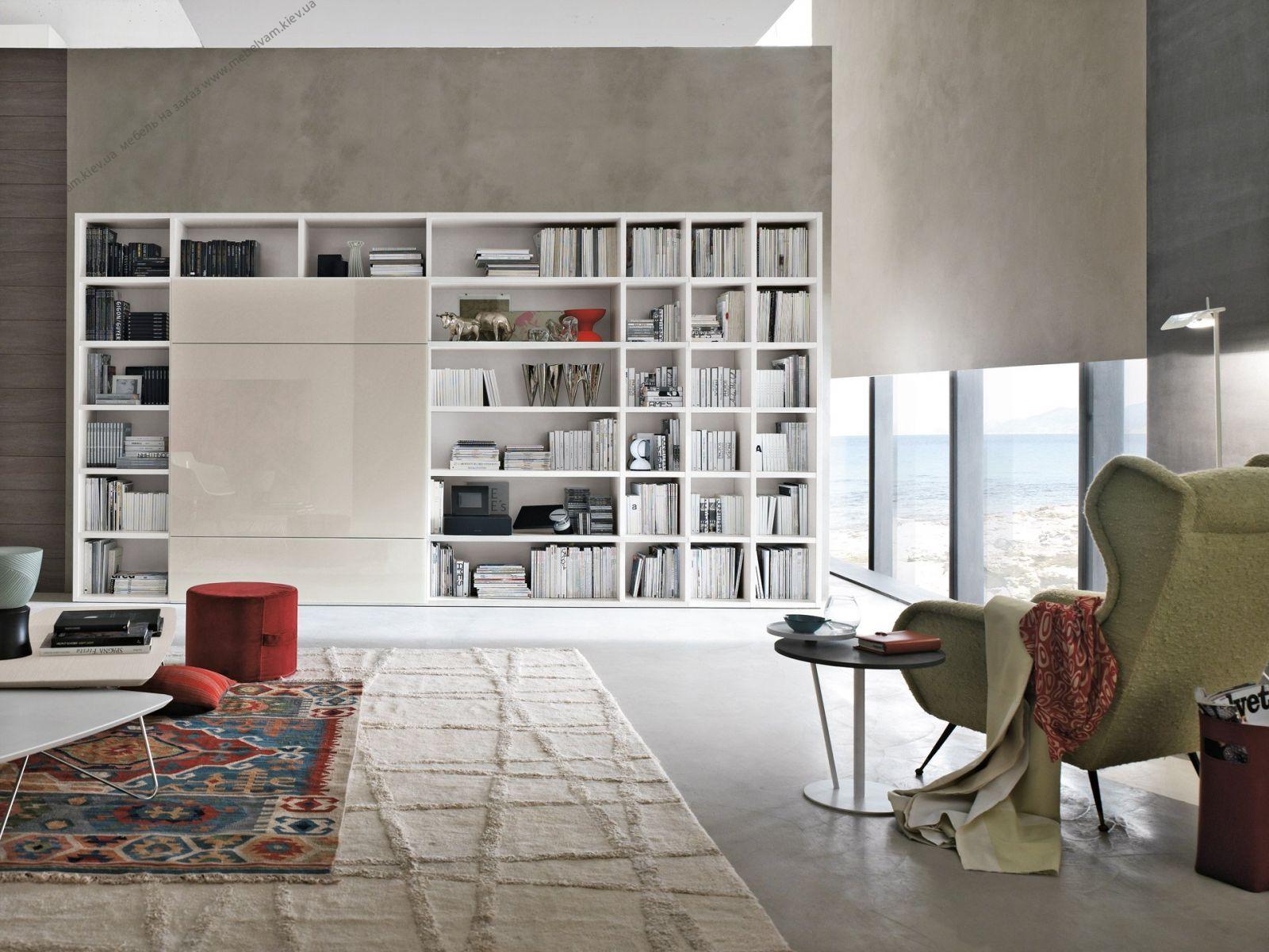 Стеллажи книжные в светлых тонах, простая конструкция сделает вашу гостину. Уютной и функциональной. Материал: Корпус - ДСП EGGER W 908 Белый базовый ST2; Фасады - МДФ крашенный RAL 9001.