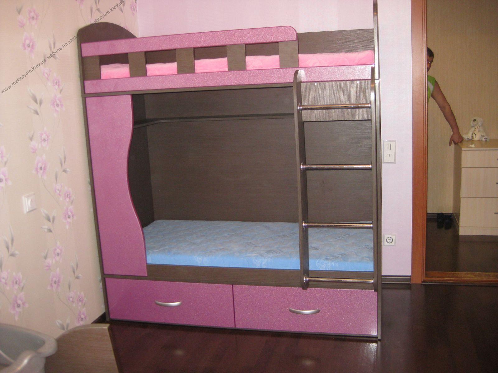 Двухэтажная кровать с двумя спальными местами, с овальным отверстием в боковине. Навесная лесенка занимает минимум места. Материал: Корпус - ДСП Egger H 1428 Вудлайн мокко ST22; Фасады – МДФ перламутр 821 Сиреневый.