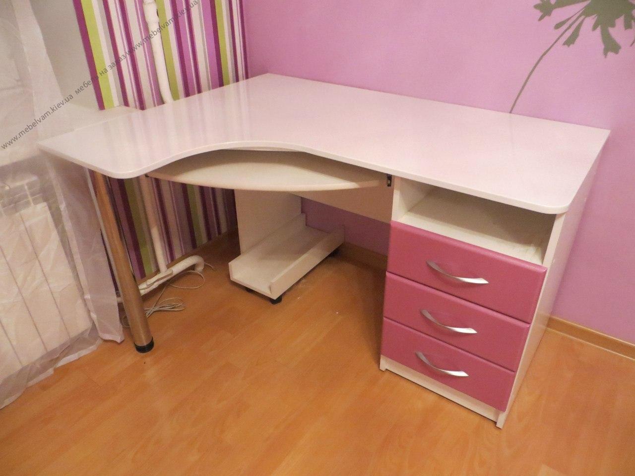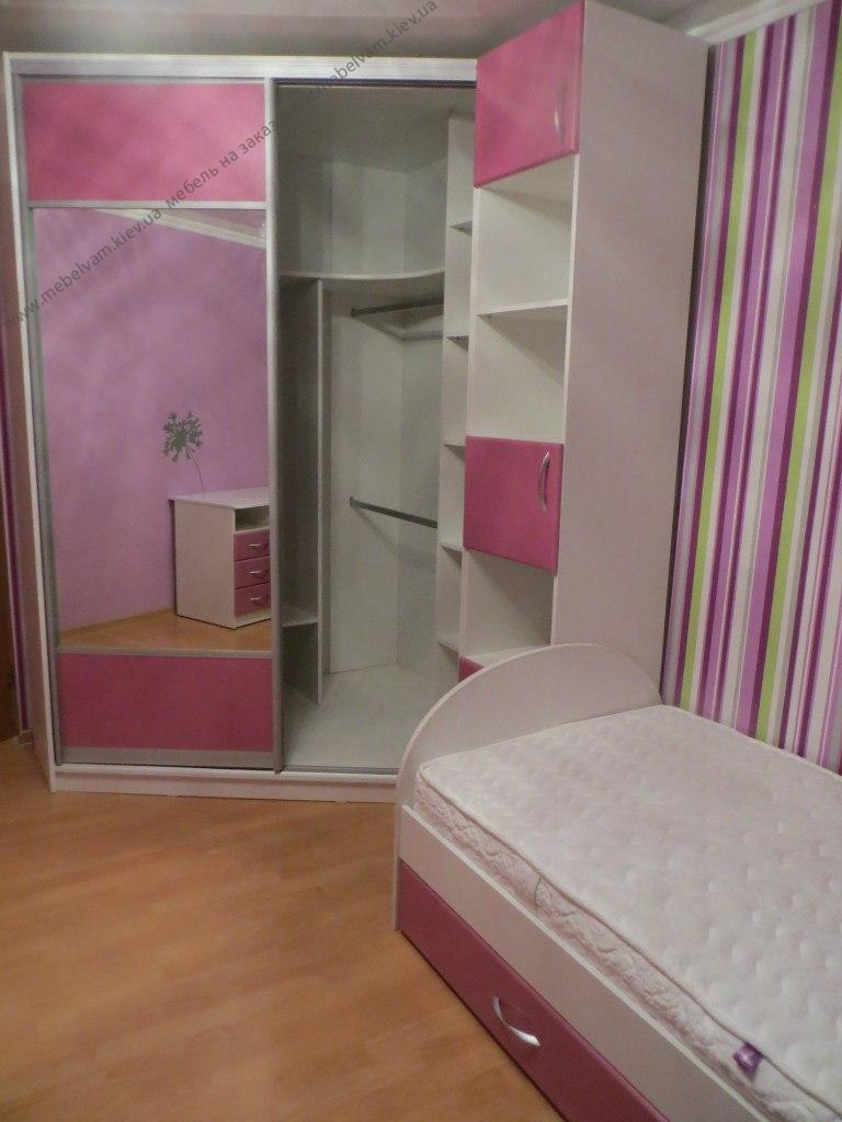 Корпусная мебель на заказ для комнаты девочки. Вместительный угловой шкаф-купе, кровать с удобным спальным местом, пенал, угловой компьютерный стол. Материал: Корпус - ДСП EGGER W 908 Белый базовый ST2; Фасады - МДФ крашенный RAL 3014, Раздвижная система Starke профиль открытый Люкс серебро.