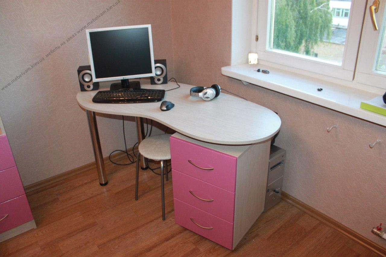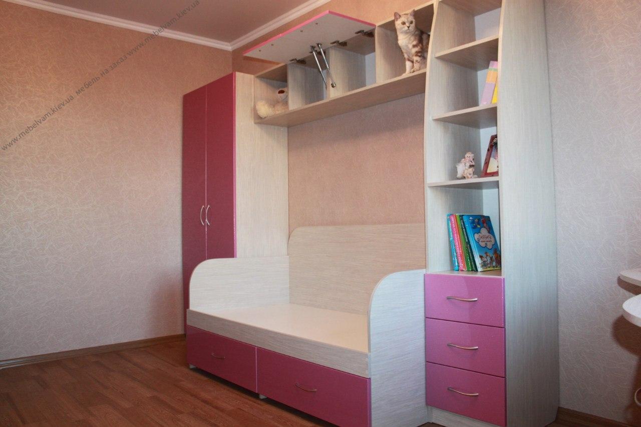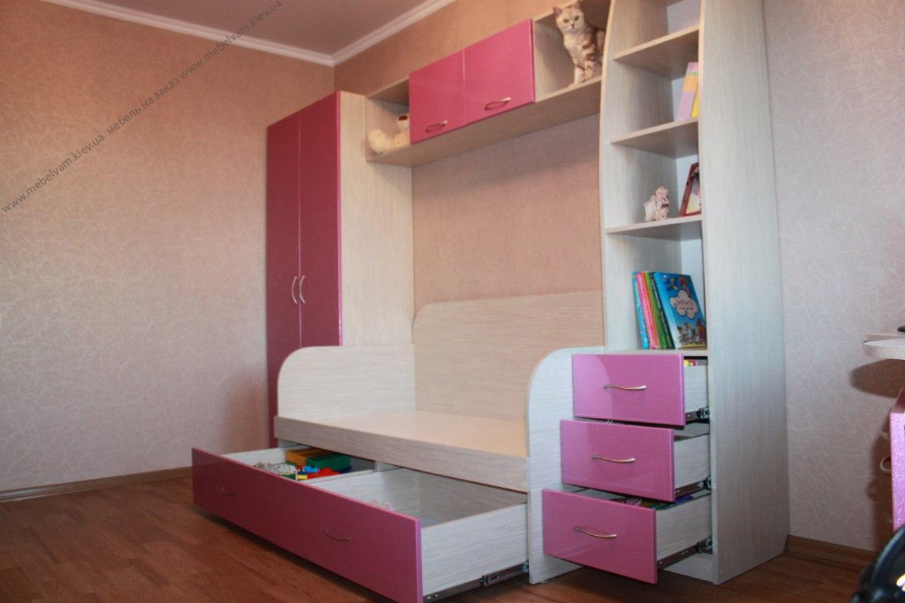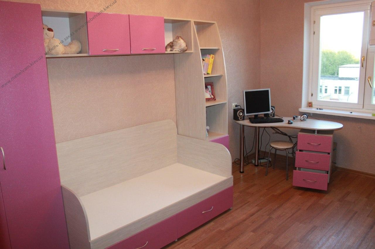 Мебель в детскую комнату под заказ. Минимальный набор мебели для детской комнаты: кровать, шкаф, пенал, навесная антресоль, стол с тумбой. Материал: Корпус - ДСП Kronospan 8622 Дуб молочный ES; Фасады - МДФ крашенный RAL 3014.
