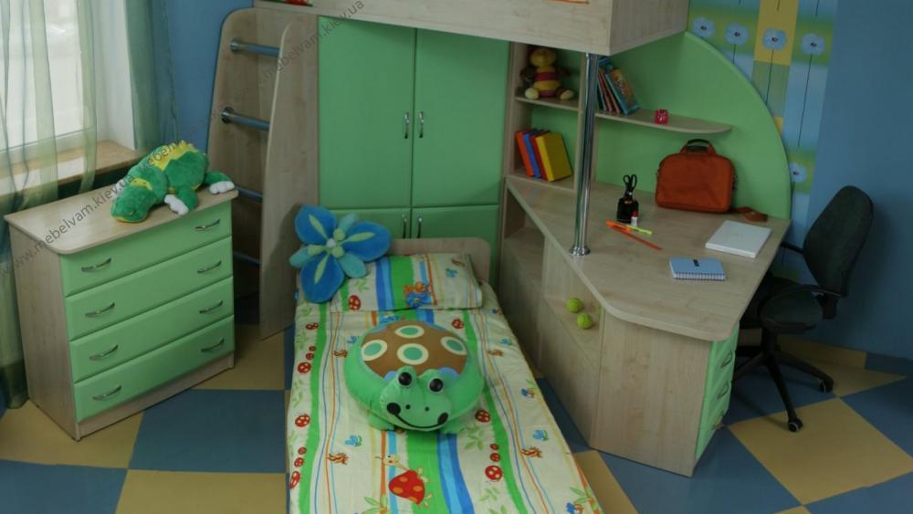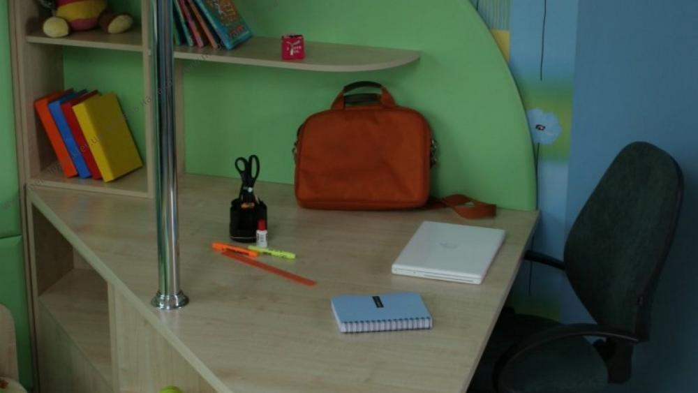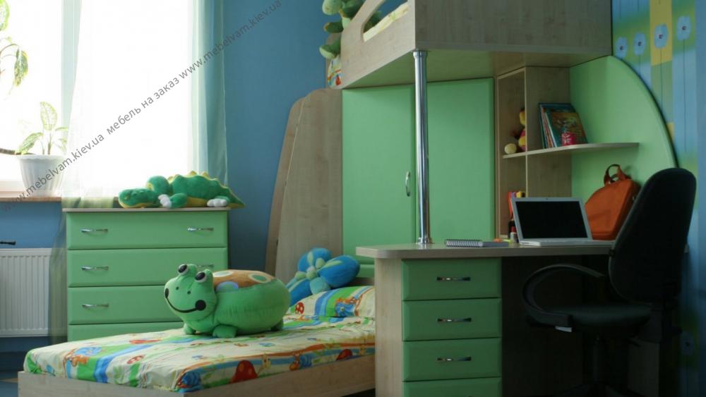 Детская мебель на заказ, кровать чердак оригинальной конструкции. Материалы: Корпус - ДСП Kronospan 0375 Клен светлый ES; Фасады – МДФ Плёнка ПВХ "ВДМ" Салат шагрень MCM0013007.