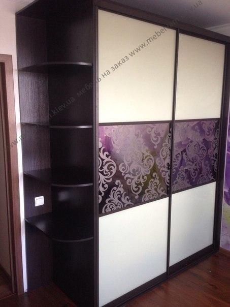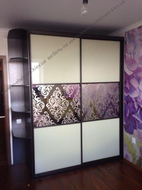 Полувстроенный шкаф-купе. В шкафу отсутствует дно, задняя стенка и одна боковина. Нижний рельс крепится к полу. Материалы: ДСП Kronospan 0854 Венге PR; Фасады - Стекло крашенное RAL 1015 Легкий слоновый, пескоструйный рисунок на зеркале бронза; Система STARKE - Профиль открытый, цвет Венге глянец.