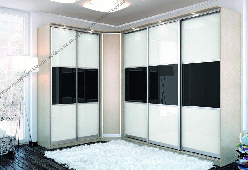 Большой угловой шкаф купе состоящий из двух шкафов-купе и углового сегмента с распашной дверцей. Материалы: ДСП Kronospan 8622 Дуб молочный ES; Фасады - Стекло крашенное RAL 9010 Чистый белый, RAL 9017 Черный глубокий; Система STARKE - Профиль открытый, цвет Алюминий.