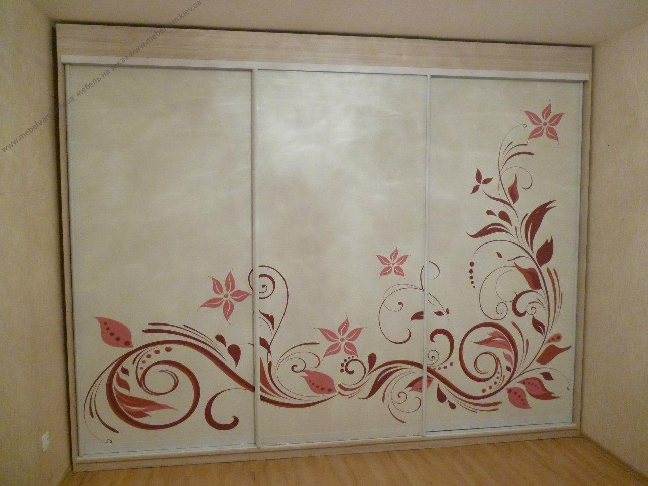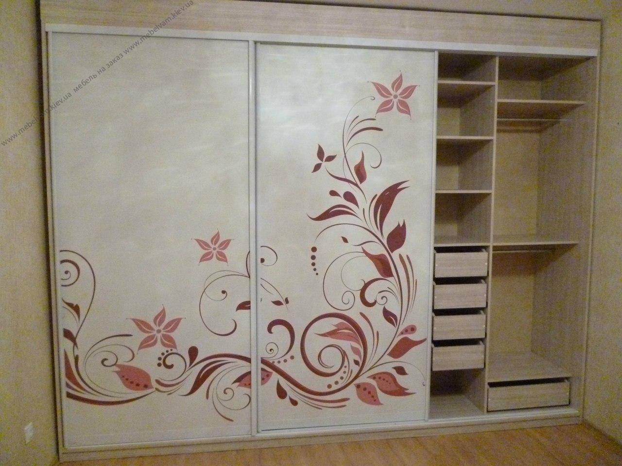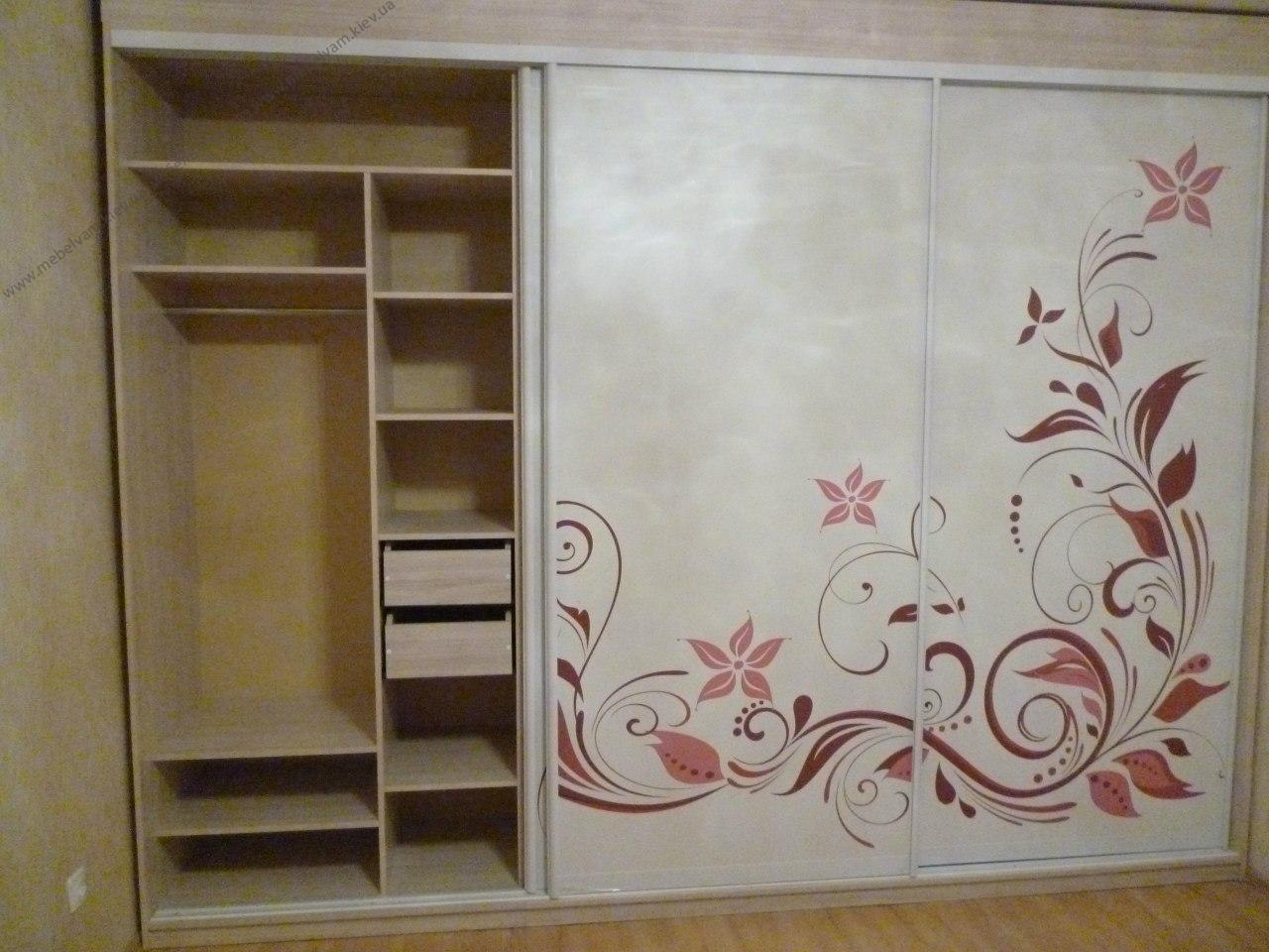 Трехдверный шкаф-купе. Наполнение шкафа: ящики, полочки, штанги и компьютерный стол с тумбой. Материалы: ДСП Kronospan 8622 Дуб молочный ES; Фасады - Фотопечать; Система Braun - цвет Белый.