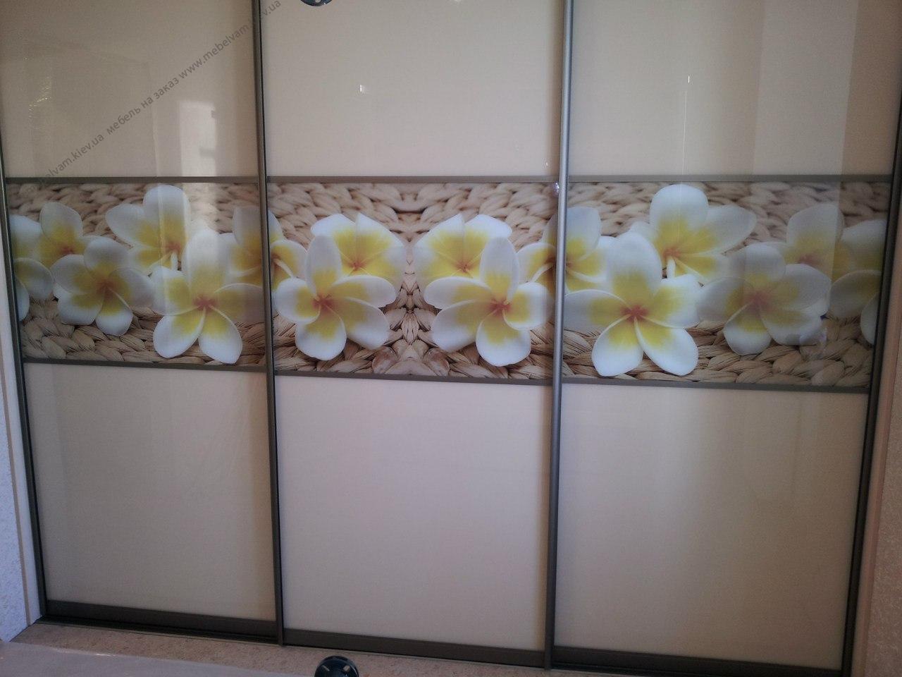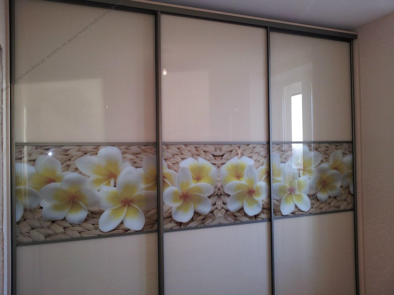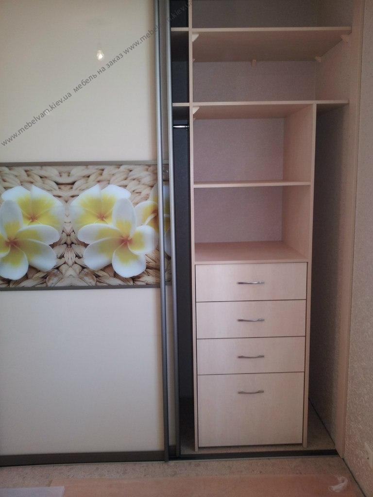 Шкаф-купе с нишей для гладильной доски. Материалы: ДСП Kronospan 8622 Дуб молочный ES; Фасады - Фотопечать, Стекло крашенное; Система STARKE - Профиль открытый, цвет Шампань.