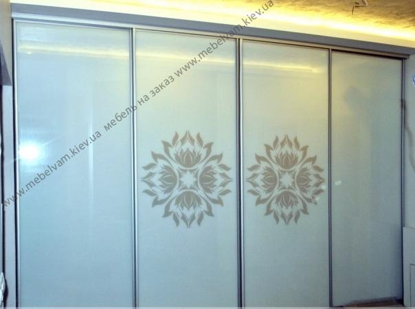 Раздвижные двери-купе. Материалы: Фасады - Стекло крашенное; Система STARKE - Профиль открытый, цвет Алюминий.