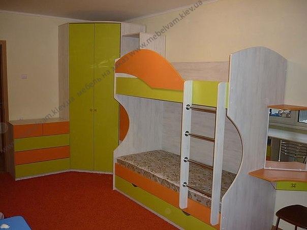 В небольшой комнате, в которой живут двое детей, необходимо оставить максимум свободного пространства. При этом мебель должна быть эргономичной, практичной, удобной и вместительной. Идеальным решением в этом случае будет двухъярусная кровать. Материалы: Корпус - ДСП Kronospan 8248 Колониалтаймс светлый BS; Фасады – МДФ Артель Олива 4В29G, Оранж 1495G.