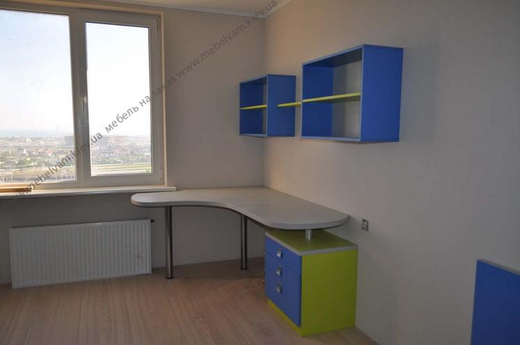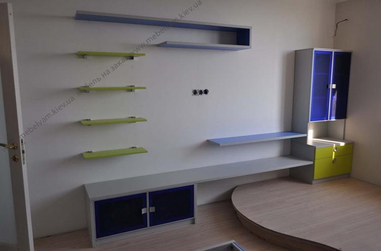Современная детская мебель на заказ по индивидуальному проекту. Материалы: ДСП Kronospan 0881 Алюминий РЕ, 5519 Лайм Грас РЕ, 0125 Королевский Синий РЕ. Стекло в алюминиевой рамке.