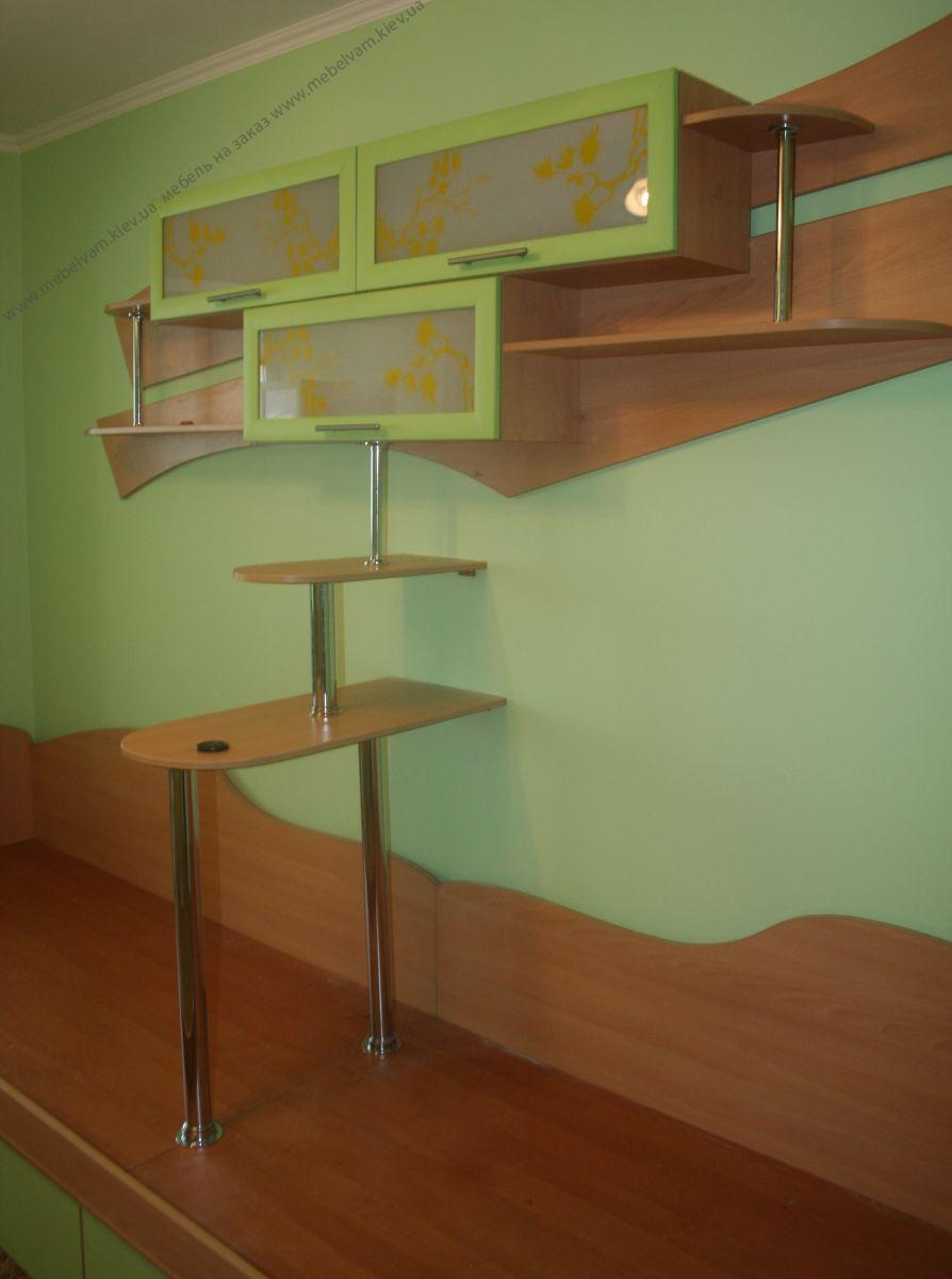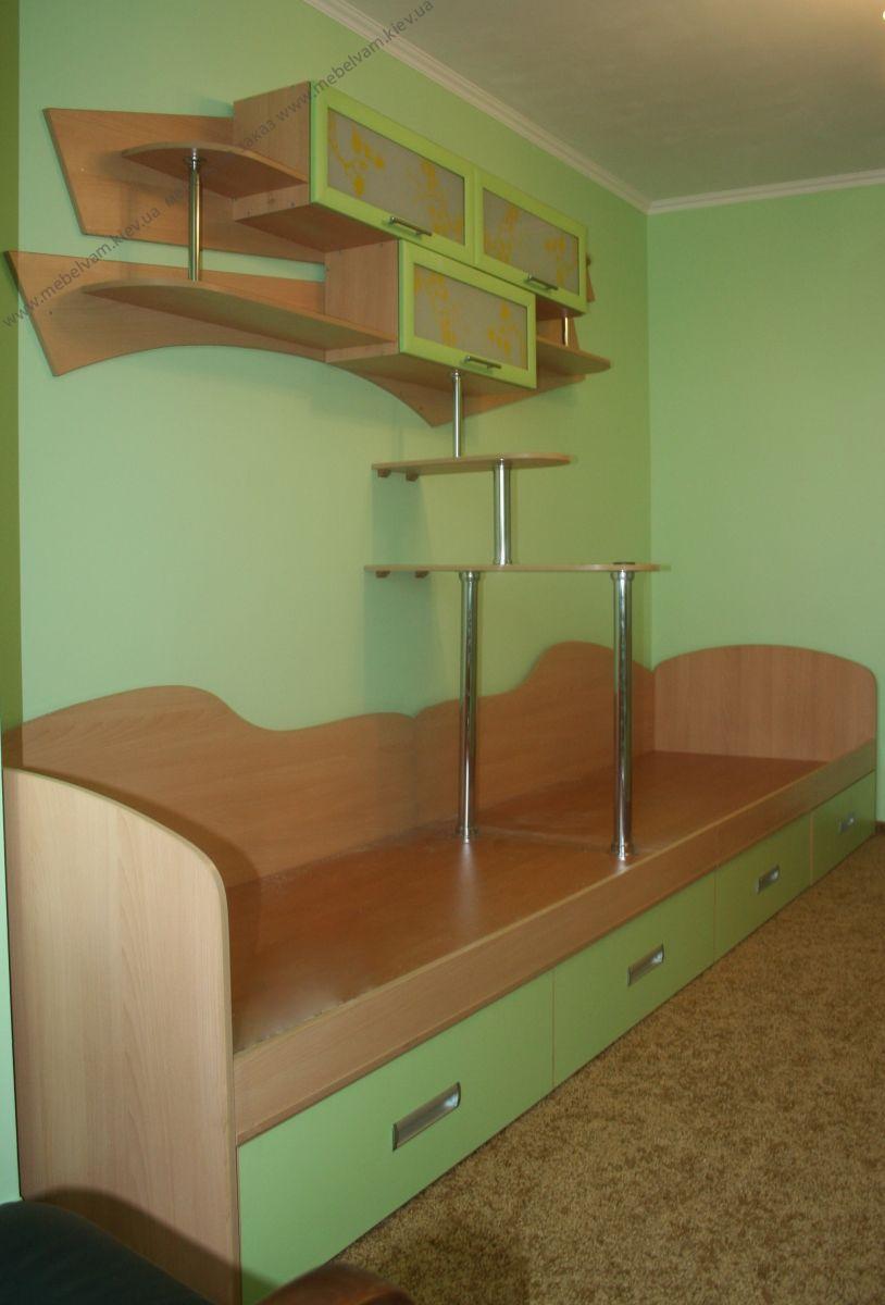 Детская кроватка с выдвижными ящиками, навесными шкафчиками, открытыми полочками. Материал: Корпус - ДСП Бук темный; Фасады - ДСП Зеленая вода.