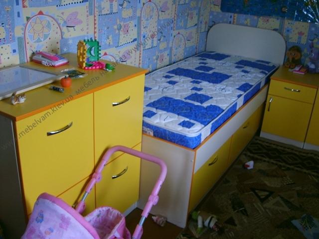 Кровать подростковая с выдвижными ящиками для белья, изготовленная из ламинированного ДСП. Материал: Корпус - ДСП Белое; Фасады - ДСП Желтое.