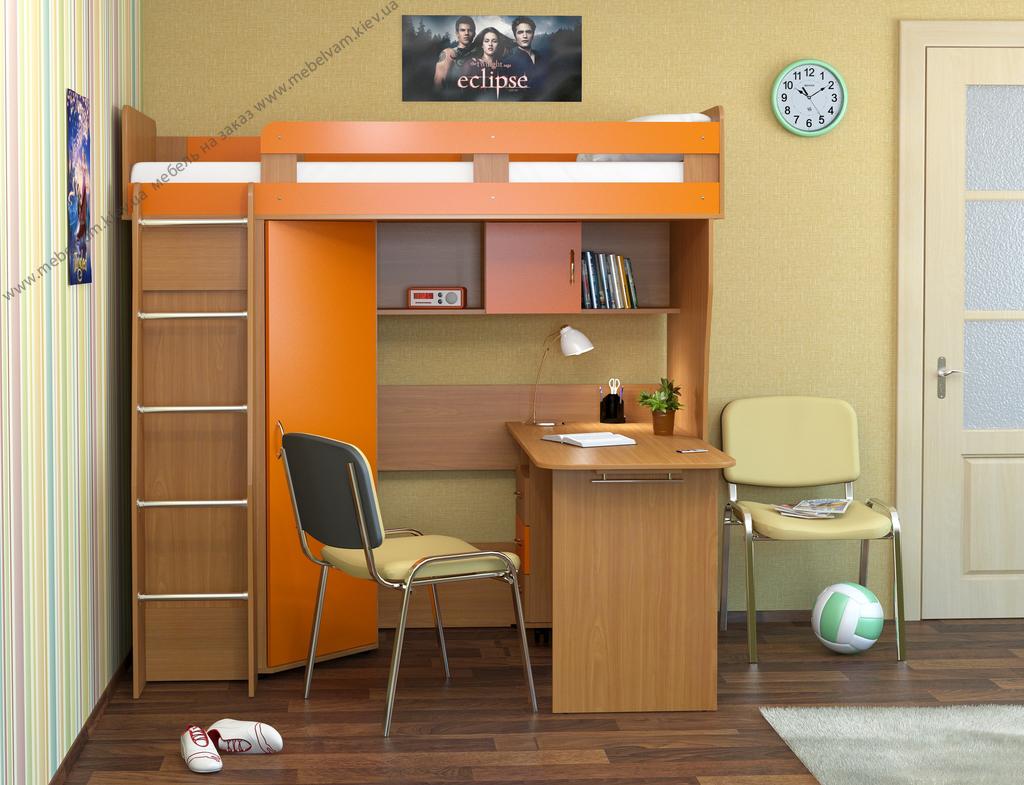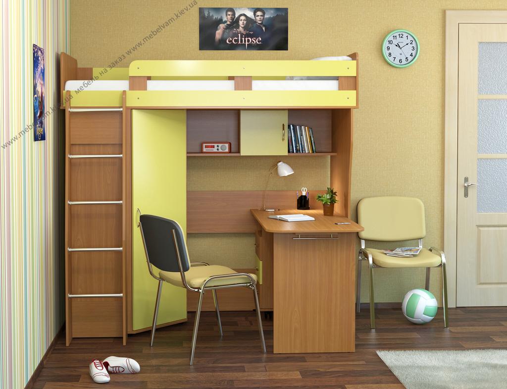 Оригинальная кроватка с компьютерным столом и угловым шкафчиком. Кровать можно изготовлять как комбинированную в двух цветах, как и в одном. Материал: Корпус - ДСП; Фасады - ДСП.