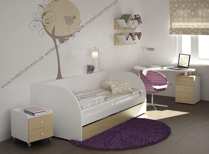 Односпальная детская кроватка с двумя выдвижными ящиками для белья. Изготовленная в красивом сочетании двух цветов ДСП. Материал: Корпус - ДСП Белое; Фасады ДСП.