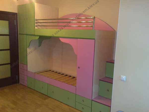 Двухэтажная кровать с множеством ящиков в пеналах, в лесенке,а также в самой кровати. На втором этаже разместилась кровать и антресоли. Материалы: Корпус - ДСП Береза; Фасады – ДСП EGGER U 630 Лайм ST15, U 336 Орхидея ST9