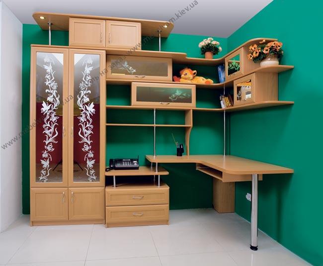 Угловой комплект мебели с красивыми стеклянными фасадами, на которые нанесен пескоструйный рисунок. Дополнена мебель подсветкой.Материал: Корпус - ДСП Орех лесной; Фасады - в рамке МДФ ДСП Орех лесной, Стекло Графит с рисунком.