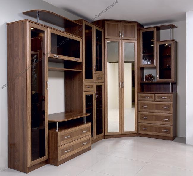 Угловая стенка для гостиной. В комплекте: два пенала, тумба ТВ, комод и полки. Материал: Корпус - ДСП Орех лесной; Фасады - в рамке МДФ Стекло Графит + ДСП Орех лесной.