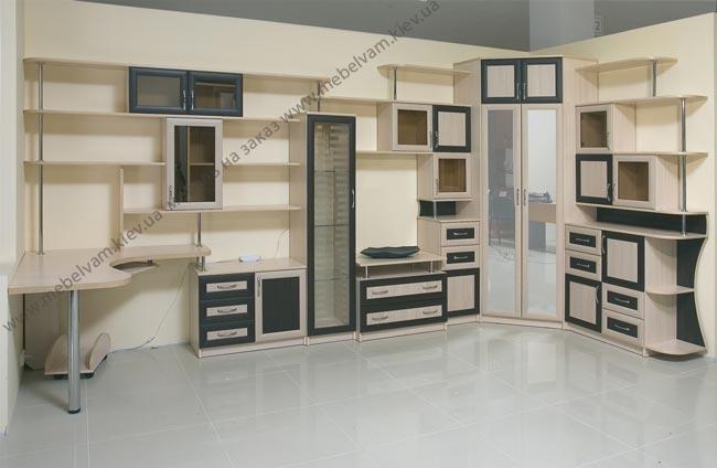 Угловой комплект мебели на заказ для гостиной. Оборудован большим количеством открытых полок, шкафов, пеналов, угловым столом и тумбами. Материал: Корпус - ДСП Дуб молочный; Фасады - в профиле МДФ Стекло + Зеркало + ДСП.