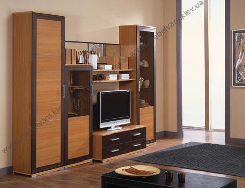 Мебельная стенка подойдёт для ценителей классической мебели. Включает в себя традиционные для стенки отделения - тумбу под ТВ, отделения с открытыми полочками, шкаф для одежды, шкаф для посуды. Материал: Корпус - ДСП Орех миланский; Фасады - в профиле МДФ ДСП Орех миланский.
