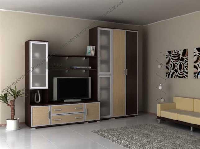 Мебельная стенка выполнена в современном стиле. Имеет большую открытую нишу под телевизор, вокруг которой расположены разные шкафы и полочки. Есть удобные отделения для аппаратуры. Материал: Корпус - ДСП Дуб Венге темный; Фасады - ДСП Береза белая + Стекло сатин в профиле МДФ.
