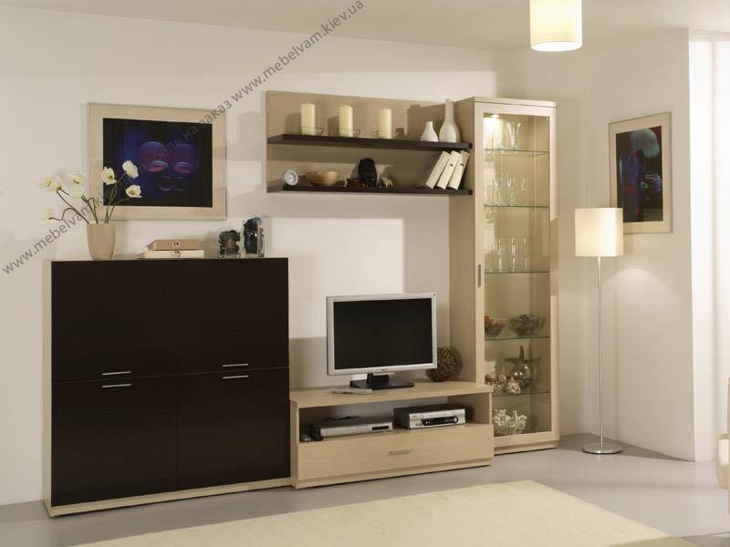 В этой мини-стенке много открытых и закрытых полочек для хранения вещей. Ниша под телевизор есть, и отделение за стеклом, которое можно использовать как барное. Всё необходимое для современной гостиной! Материал: Корпус - ДСП Дуб Молочный; Фасады - МДФ Черный глянец + Стекло.