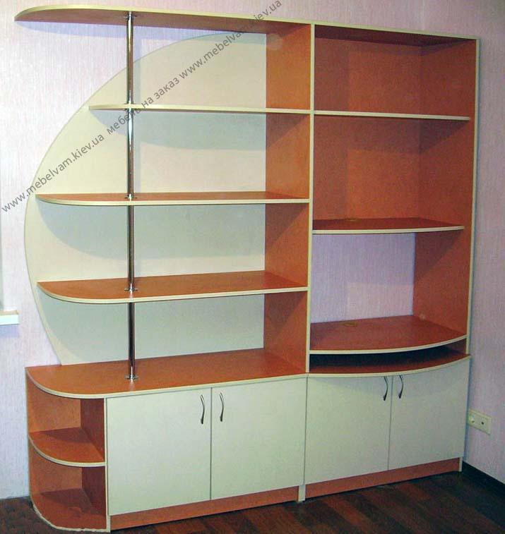 Небольшого размера горка мебельная оборудована большим количеством открытых полок на металлических трубах. Есть ниша для телевизора. Материал: Корпус - ДСП Терра оранж; Фасады - ДСП Зеленая вода.
