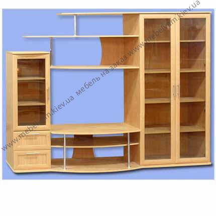 Маленькая мебельная горка, состоящая из шкафа со стеклом в профиле МДФ, открытой тумбы для телевизора, пенал с ящиками и дверкой. Материал: Корпус - ДСП Ольха светлая; Фасады - в рамке МДФ Стекло, ДСП.
