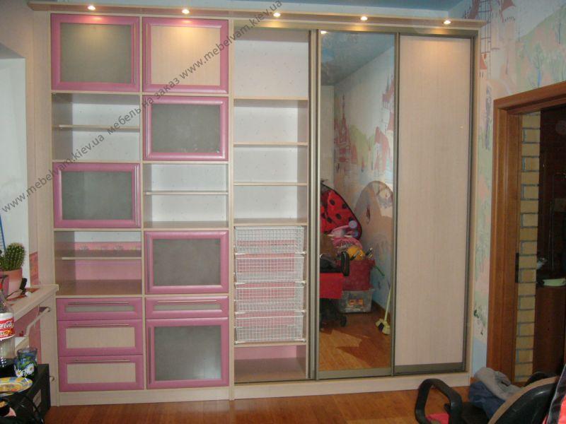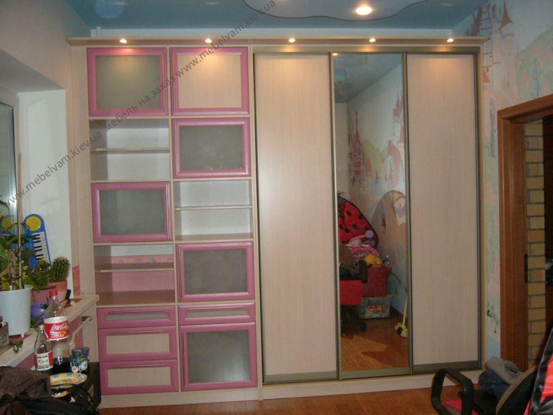 Красивая мебельная стенка для гостиной со шкафом-купе. Фасады ДСП и зеркало в раздвижной системе Браун Браш. Крыша с подсветкой. Материал: Корпус - ДСП Дуб молочный; Фасады - в рамке МДФ стекло Сатин, система Вraun - цвет Браш.