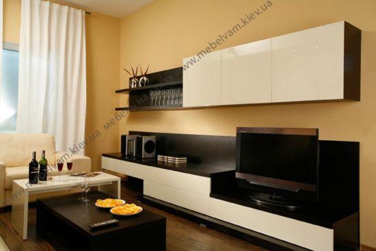 Стенка в стиле хай-тек, лаконичный дизайн, прямые линии, прямоугольные формы. Материал: Корпус - ДСП Черное, Фасады - МДФ Белый глянец.