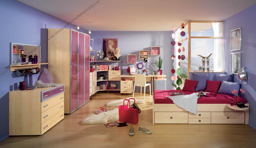 Оригинальный комплект детской мебели, вместительный трехдверный шкаф, комод, кроватка с выдвижными ящиками. Материал: Корпус - ДСП Береза белая; Фасады - МДФ + ДСП.