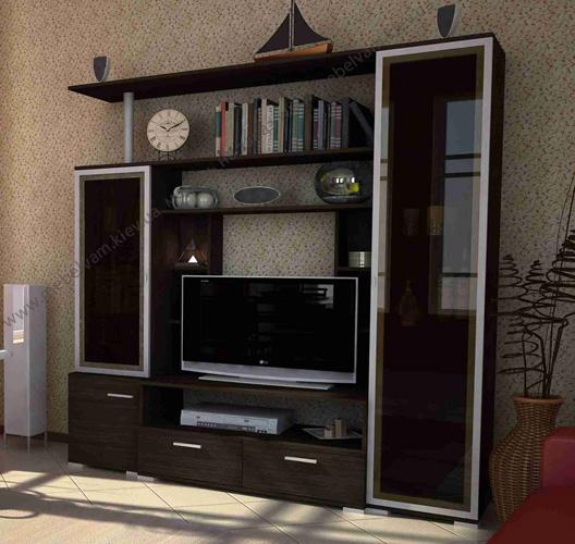 Маленькая горка мебельная с пеналом со стеклянным фасадом, в котором размещены полки для книг и различных элементов декора гостиной. Материал: Корпус - ДСП Дуб Венге темный; Фасады - ДСП Дуб Венге темный, Стекло тонированное в алюминиевой рамке.