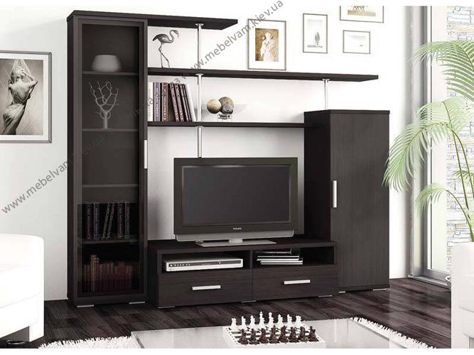 Маленькая компактная горочка для небольшой гостиной, очень аккуратная и красивая композиция из пеналов, Тв тумбы и навесных облегченных полок. Материал: Корпус - ДСП Дуб Венге темный; Фасады - ДСП Дуб Венге темный, Стекло тонированное в МДФ рамке.