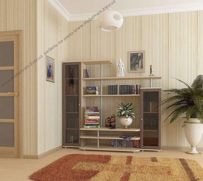 Маленькая горочка на заказ состоит из двух стеклянных пеналов, навесных полок и тумбы. Материал: Корпус - ДСП Дуб Венге светлый; Фасады – Стекло тонированное в МДФ рамке Орех темный.