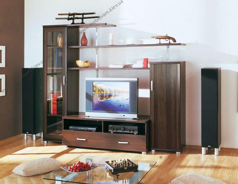 Горка под заказ маленьких размеров состоит из двух пеналов (закрытого и со стеклянным фасадом), ТВ тумбы и полок. Материал: Корпус - ДСП Орех Болонья темный; Фасады - МДФ Ореховый, Стекло тонированное в МДФ рамке.