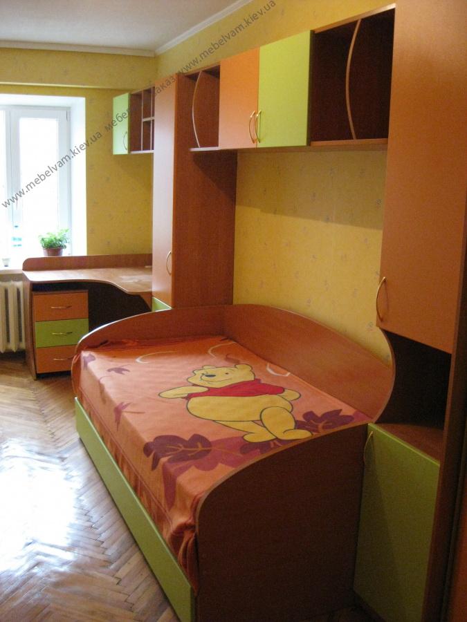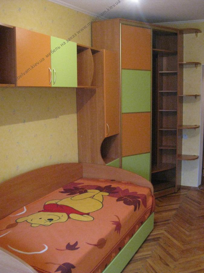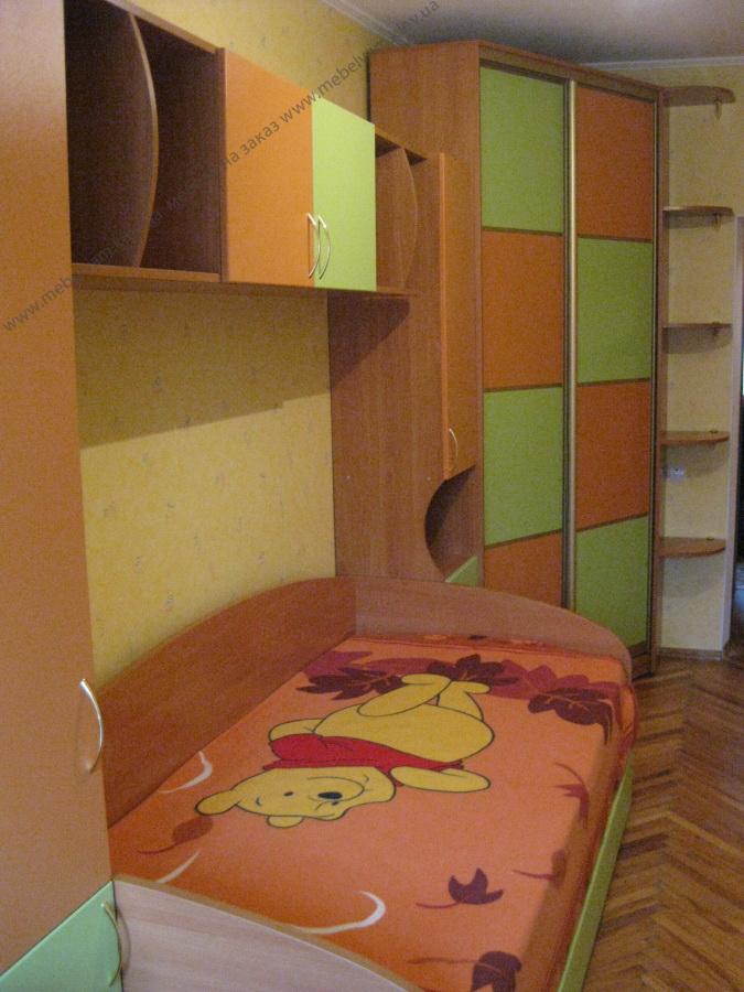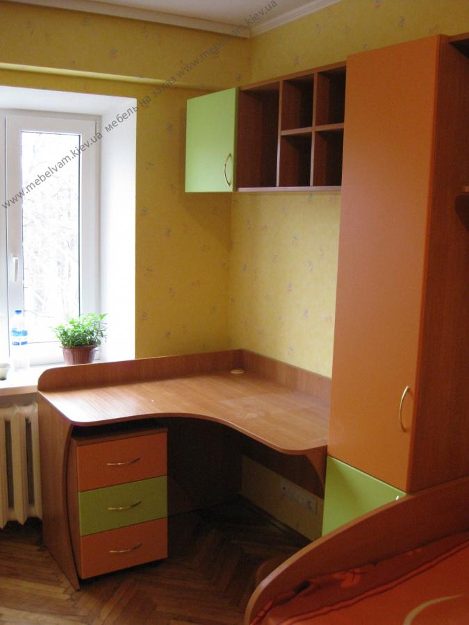 Комплект детской мебели состоит из углового шкафа-купе с МДФ фасадами поделенными с помощью разделительного профиля, компьютерного стола, кровати с ящиками, антресолей над кроватью и столом, пеналов. Материал: Корпус - ДСП Вишня; Фасады - МДФ Оранжевая шагрень, евкалипт шагрень.