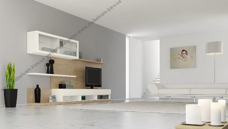 Современная мебель для гостиной отличается своей простотой, практичностью, прямыми формами, наличием открытых полок на задней стенке, невысокими нижними тумбами. Материал: Корпус, Фасады - ДСП Белое, Задняя стенка, подиум - Дуб Ясный.