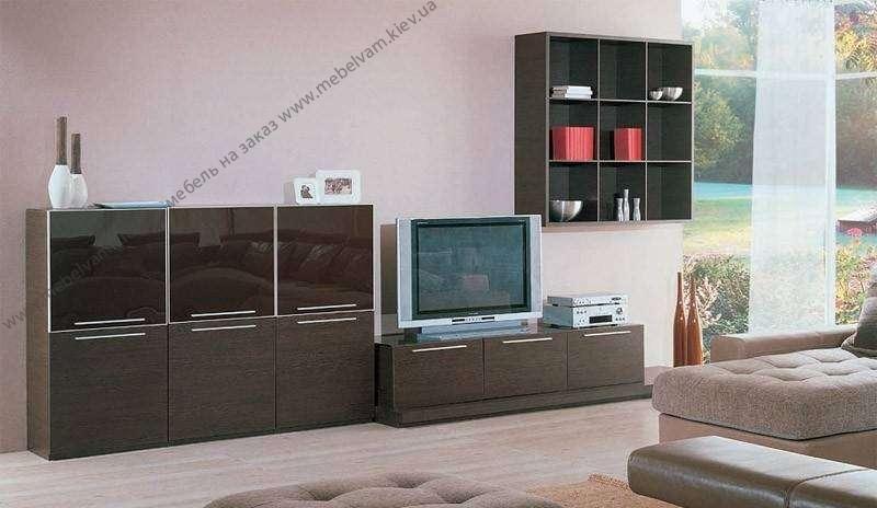 Набор корпусной мебели в зал, состоит из тумбы под телевизор, напольного невысокого шкафчика и навесных открытых полок. Материал: Корпус - ДСП Дуб Венге темный, Фасады - ДСП Дуб Венге темный, Стекло крашенное в алюминиевой рамке.